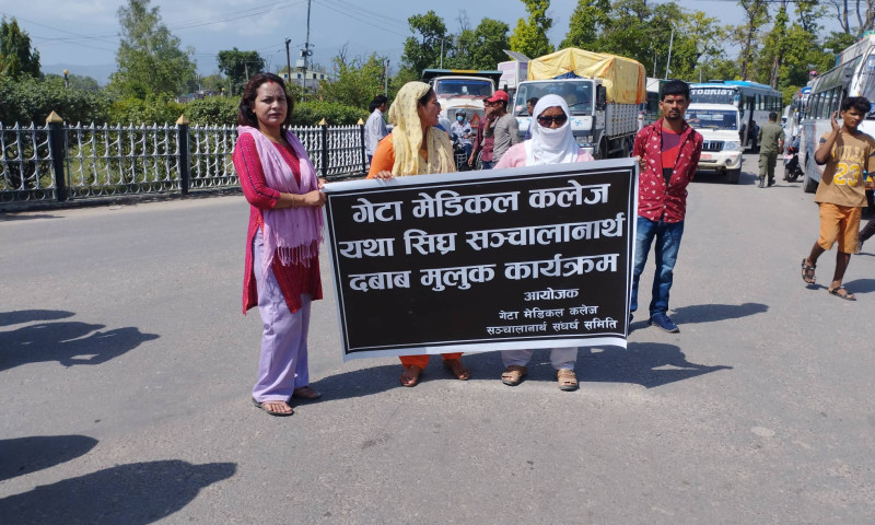 गेटा मेडिकल कलेज सञ्चालनका लागि गठित संघर्ष समितिले दबाब कार्यक्रमको थालनी गरेको छ । सरकारको नीति तथा कार्यक्रममा सञ्चालनका लागि आधारभूत संरचना तयारी अवस्थामा रहेको गेटा मेडिकल कलेज नअटाएपछि दबाबमूलक कार्यक्रम थालनी गरिएको हो।