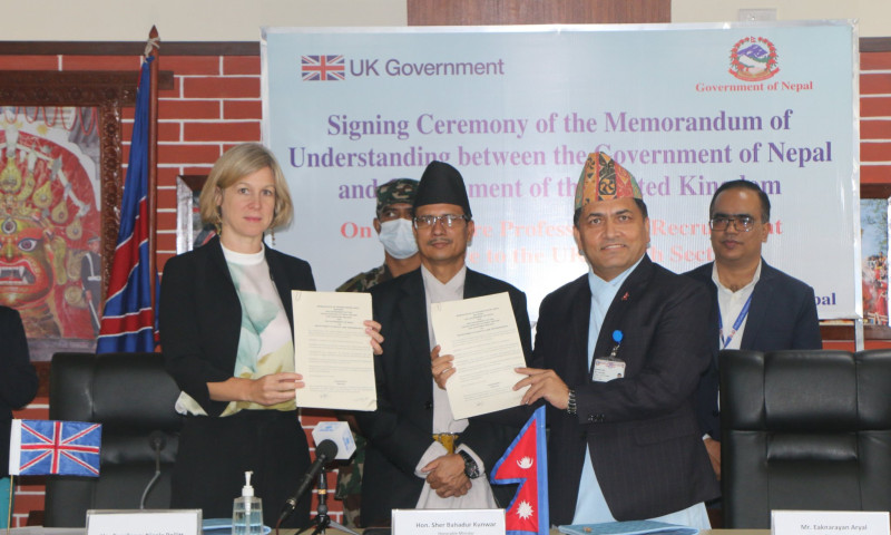 स्वास्थ्य क्षेत्रका जनशक्ति लैजाने विषयमा सोमबार श्रम, रोजगार तथा सामाजिक सुरक्षा मन्त्रालयमा श्रम सचिव एकनारायण अर्याल र नेपालका लागि बेलायती राजदूत निकोला पोलिटले समझदारीपत्रमा हस्ताक्षर गरे ।
