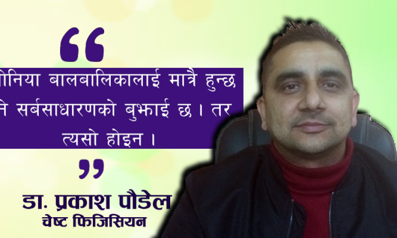निमोनिया बालबालिकालाई मात्रै हुन्छ भन्ने सर्बसाधारणको बुझाई छ । तर त्यसो होइन । रोगसँग लड्ने क्षमता कम भएका जोसुकैलाई पनि निमोनियाको जोखिम रहने चेष्ट फिजिसियन डा. प्रकाश पौडेलको भनाइ छ । डा. पौडेलले निमोनियाबाट जोगिन र निमोनिया भइहाले के गर्ने भनेर केही सुझाब दिएका छन् । जानौं डा. पौडेलले दिएका सुझाब :-
