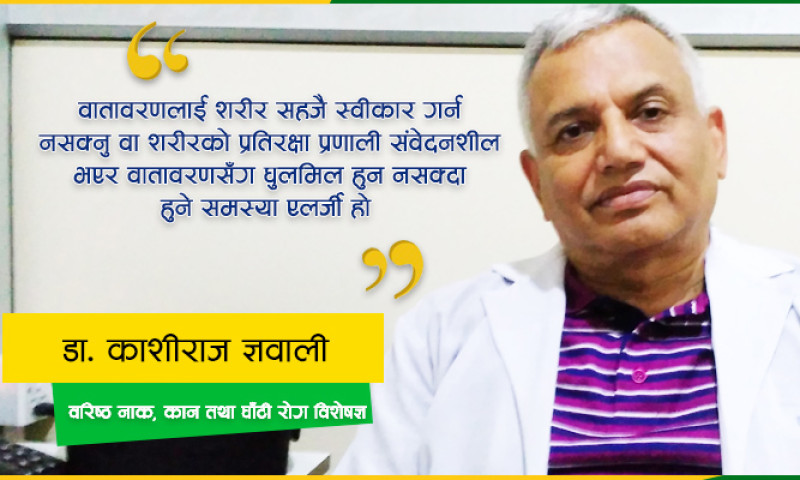 वातावरणीय प्रदुषणका कारण मानव स्वास्थमा विभिन्न प्रकारका समस्याहरू देखिने क्रम बढ्दो छ । विशेषगरी प्रदुषणका कारण श्वासप्रश्वासजन्य समस्याबाट शहरी क्षेत्रमा बस्ने मानिसहरू बढी पीडित भइरहेका छन् । यसर्थ, ग्रामीण भेगमा बस्नेलाई पनि समस्या नभएको भने होइन । वातावरणीय प्रदुषणका कारण शरीरका जुनसुकै अंगमा एलर्जी हुने क्रम बढ्दो छ । त्यसमा पनि नाकको एलर्जी बढी देखिहरेको छ । नाकको एलर्जी किन हुन्छ ? यसबाट जोगिन के गर्ने ? वरिष्ठ नाक, कान, घाँटी रोग विशेषज्ञ डा. काशीराज ज्ञवालीको सुझाब यस्तो छ :–